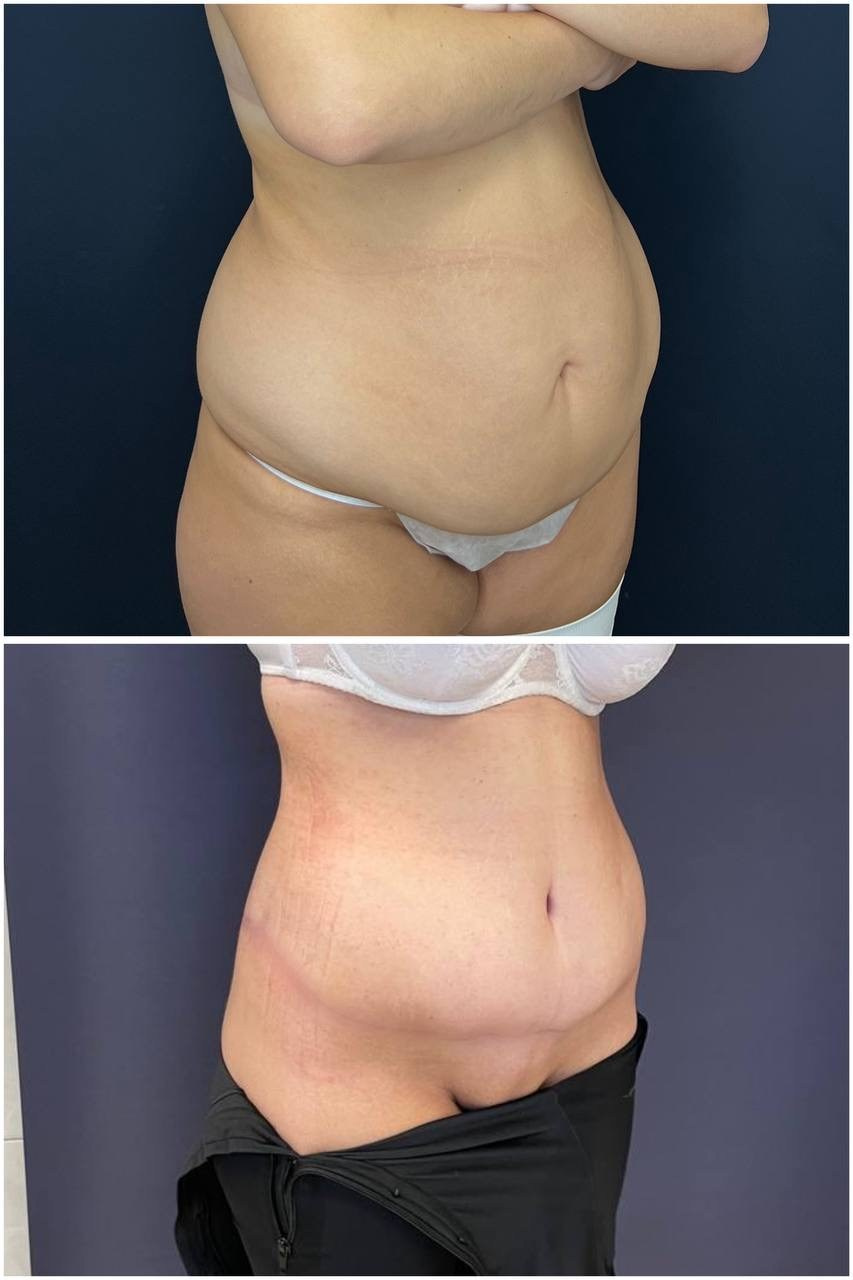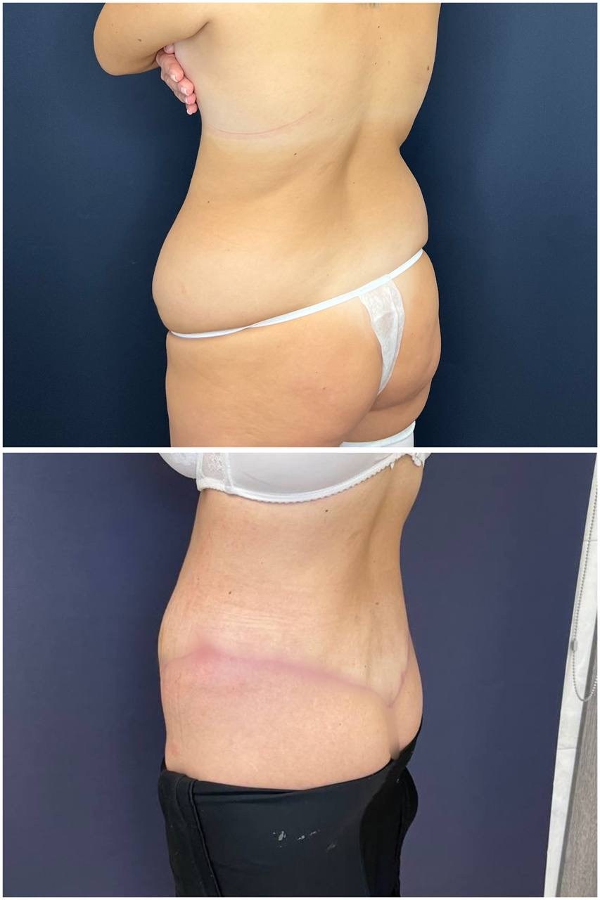 Выполнена абдоминопластика с переносом пупка, удален фартук в объеме 8 кг